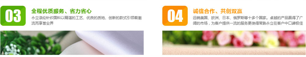 公司成立于1997年,坐落于風景秀麗的虞山腳下,位于中國經濟最活躍的版圖--長江三角洲經濟技術開發(fā)區(qū)的黃金地段上,常熟市永立針紡織有限公司,伴隨著中國針紡織品行業(yè)蓬勃發(fā)展,走過了10多年的創(chuàng)業(yè)歷程,如今已發(fā)展成為一家集工、貿于一身,在行業(yè)內聞名遐邇的專業(yè)生產滌綸針織面料的特色企業(yè)。本公司擁有來自臺灣的先進制造設備,以雙面小提花機為主的34寸(16--45針)雙面緯編機50臺、34寸(20--50針)單面開幅機9臺、36寸 22針德國邁耶OVJE雙面電腦大提花機6臺及其他先進設備。憑借著一流的設備,以及“人無我有,人有我好,人好我轉”的經營理念,常熟永立一直致力于滌綸面料的創(chuàng)新...